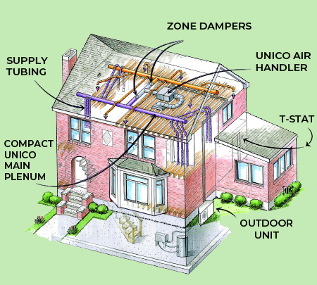 - Superior IAQ and Efficiency: The high-velocity airflow of the Unico System enhances moisture control and even temperature distribution, leading to better indoor air quality and up to 30% energy savings.
